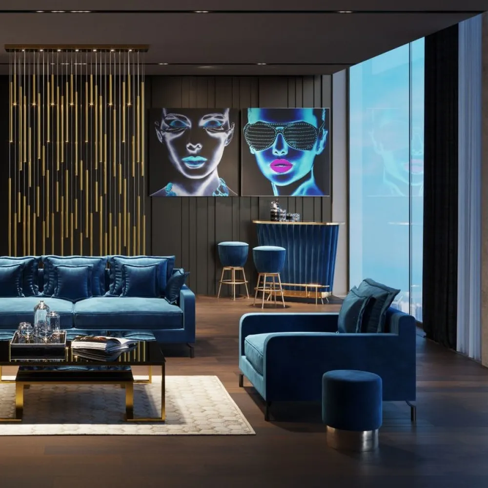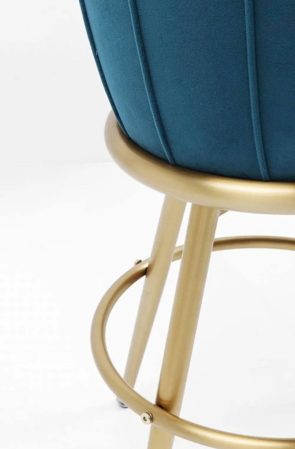 Het gebruik van hoogwaardige materialen zoals polyester, MDF, schuim en roestvrij staal zorgt voor duurzaamheid en comfort. De gouden kleur van de poten en de blauwe bekleding met een gelakte afwerking geven de barkruk een moderne en glamoureuze uitstraling.