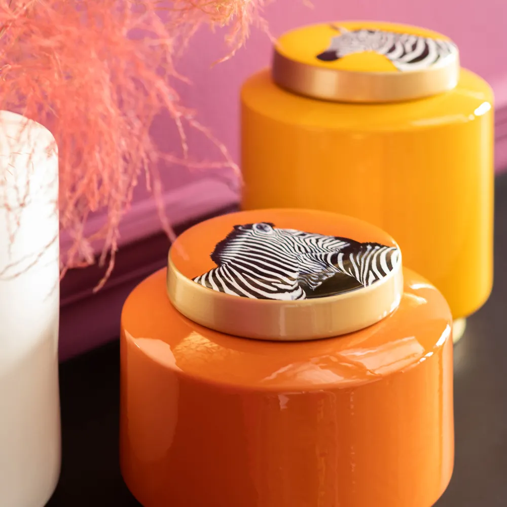 Een zon-gele pot en een zebra om een oogje in het zeil te houden: omdat kleine schatten en kleine spulletjes een decoratieve plek om opgeborgen te worden nodig hebben. En, omdat – laten we eerlijk zijn – deze kleine spulletjes niet altijd toonbaar moeten zijn. Ook beschikbaar in andere varianten.