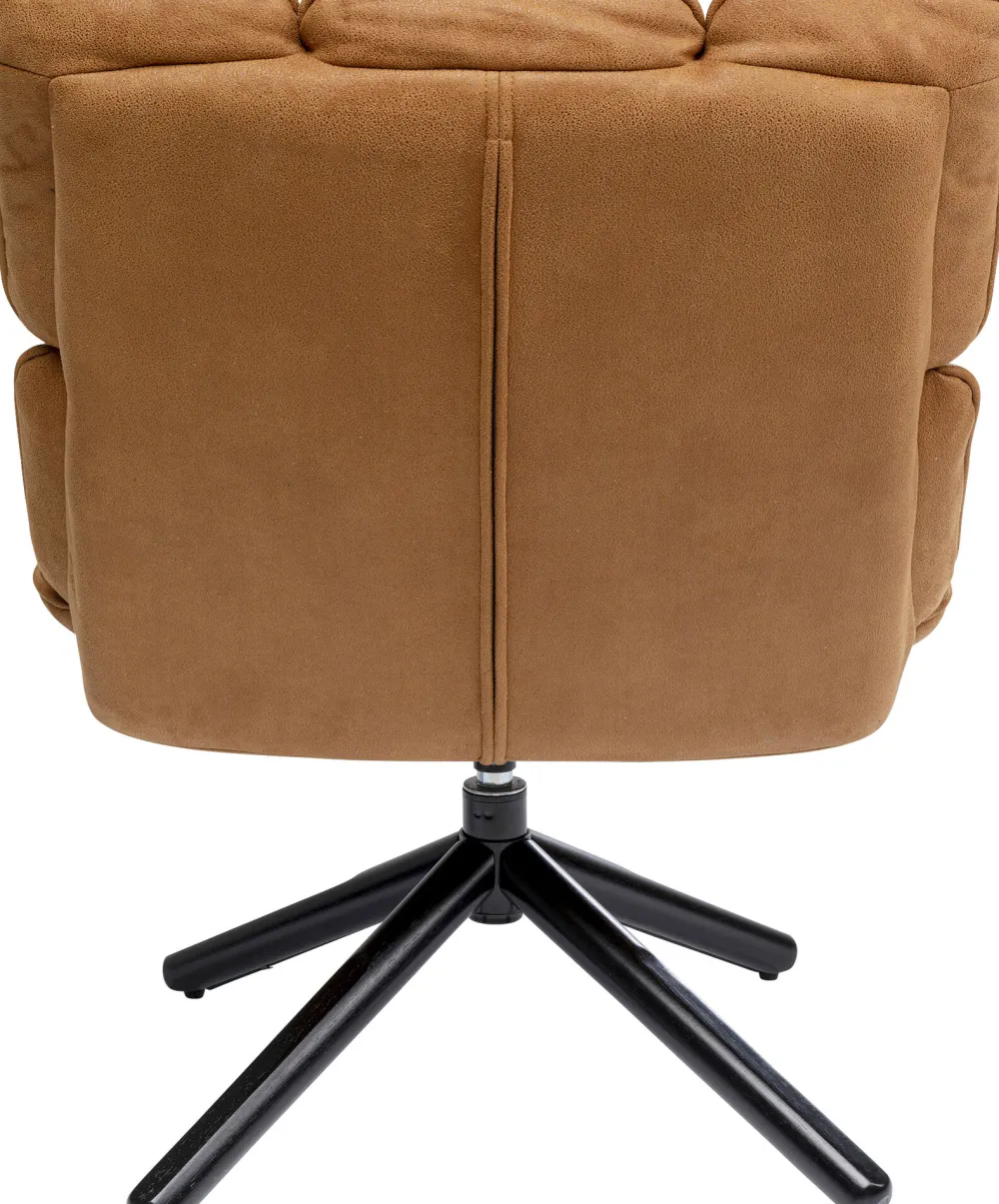 De moderne stijl van de Draaifauteuil Victor maakt hem veelzijdig genoeg om naadloos in verschillende interieurs te passen. De warme bruine kleur van de bekleding en zitting voegt een vleugje gezelligheid toe aan je ruimte, terwijl de zwarte gepoedercoate afwerking een eigentijds randje geeft.