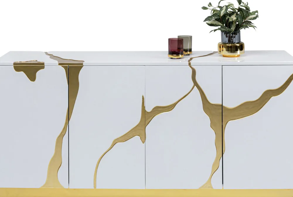 Afvegen met een natte, zachte doek is alles wat dit dressoir nodig heeft. Dit meubelstuk van KARE is een minimalistisch meesterwerk. Hij kan makkelijk gecombineerd worden met veel interieurstijlen, niet alleen in de woonkamer, of het nu klassiek, modern of glamourous elegant is. Abstract, goud-gekleurde versieringen vloeien visueel over de bovenkant en de voorzijdes van de deuren van het dressoir. De look kan geperfectioneerd worden met behulp van een tafellamp en decoratieve huis-accessoires zoals een vaas en coole objecten. De heldere, puristische vorm zorgt ervoor dat dit dressoir genoeg opslagruimte biedt voor het opruimen en opbergen. Omdat dit product handgemaakt is kunnen er afwijkingen van de afbeelding voorkomen.