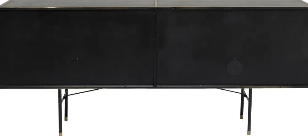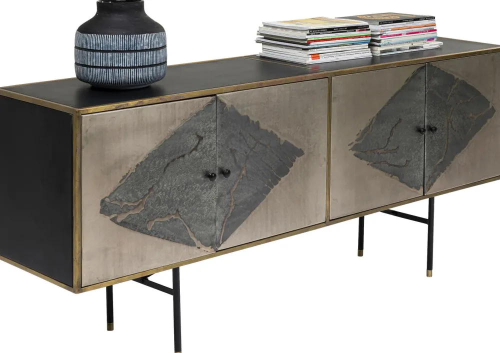 Een echt kunstwerk voor in jouw woonkamer. Zijn unieke ontwerp en de bewuste sporen op de voorzijde creëren een geometrisch maar natuurlijk effect. De gouden rand zorgt voor een beetje flair. De dunne zwarte poten zorgen ervoor dat dit dressoir er licht en open uitziet. Door de combinatie van kleuren en materialen past dit dressoir perfect bij een natuurlijke interieurstijl.