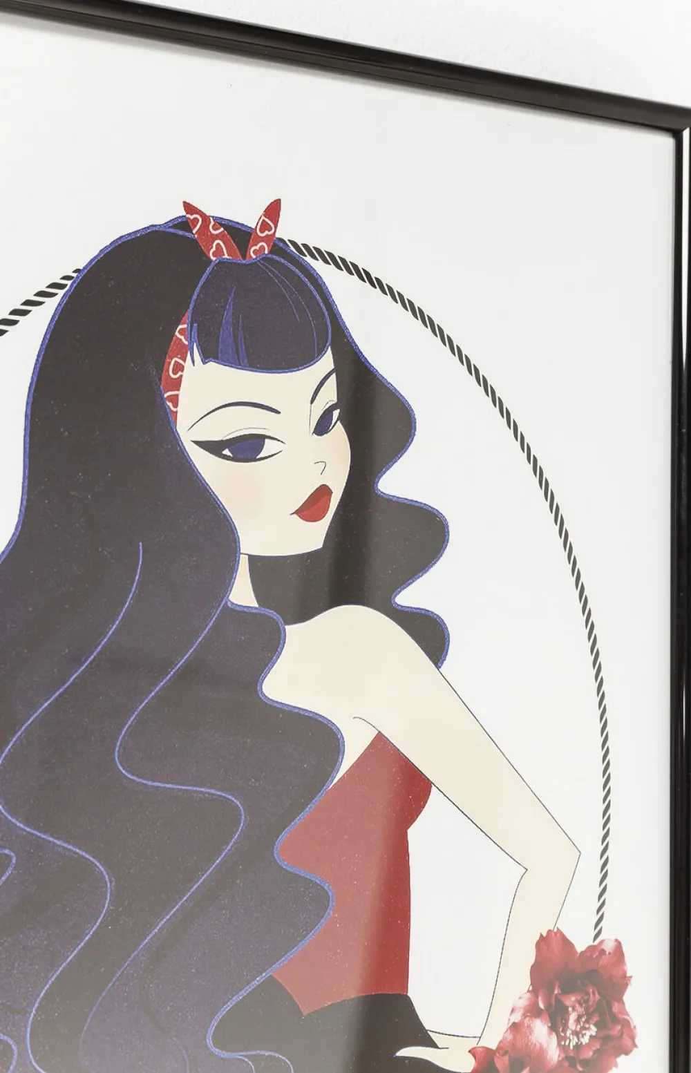Tattoo style met deze lijst! Een vintage pin-up dame met knallende kleuren. Een statement voor in elke kamer. Hang meerdere Kare lijsten bij elkaar zoals op de sfeerfoto en mix en match naar hartelust.