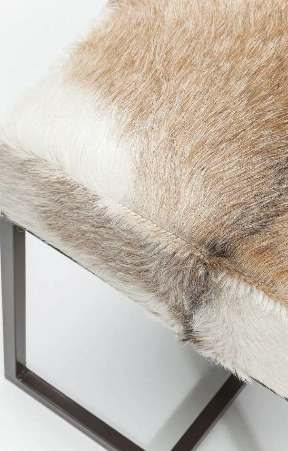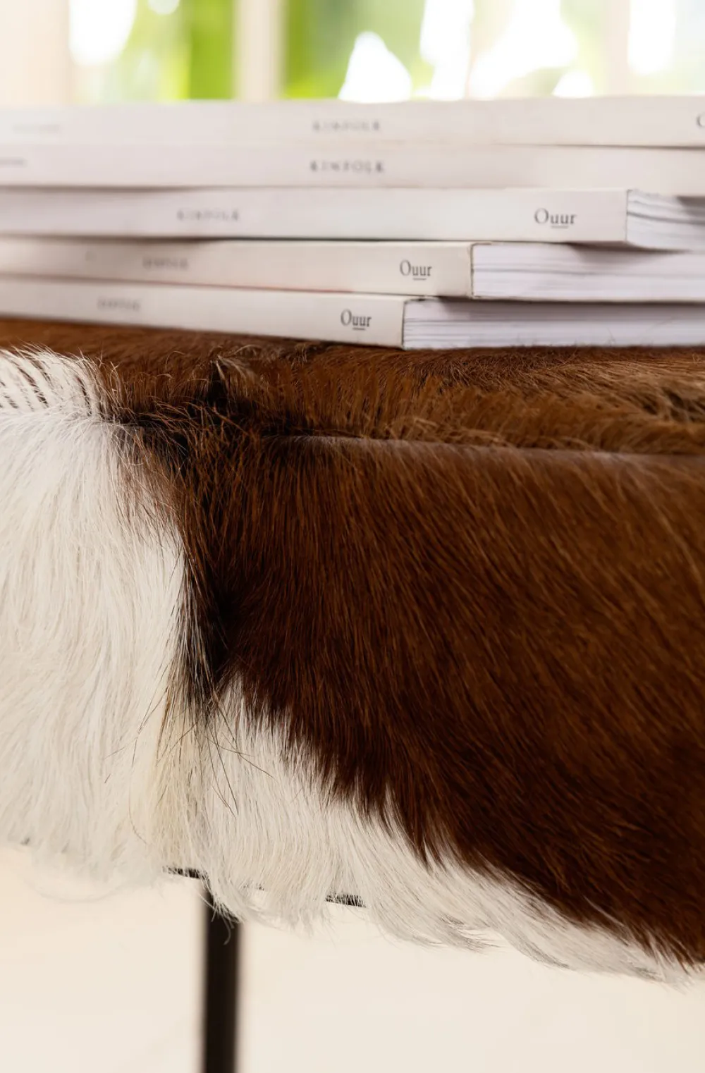 De kruk is gemaakt van hoogwaardig staal, natuurlijk leer, schuim en MDF, met een gelakte afwerking voor een verfijnde uitstraling. De zitting is bekleed met natuurlijk leer in een elegante witte, bruine, beige of zwarte kleur, waardoor je de vrijheid hebt om de kruk aan te passen aan je persoonlijke stijl.