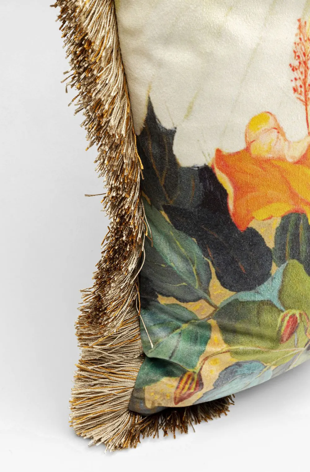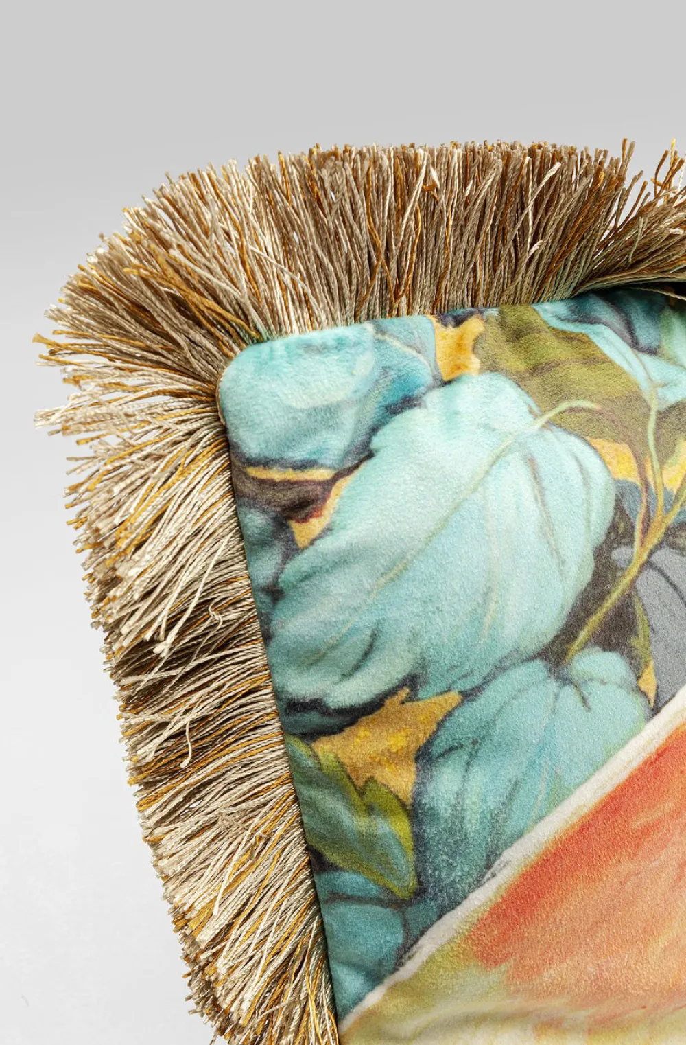 Een prachtig sierkussen voor het bed, de bank of de fauteuil met levendige kaketoes, makkelijk te combineren met effen-gekleurde kussens en andere motieven van de hedendaagse jungle look.