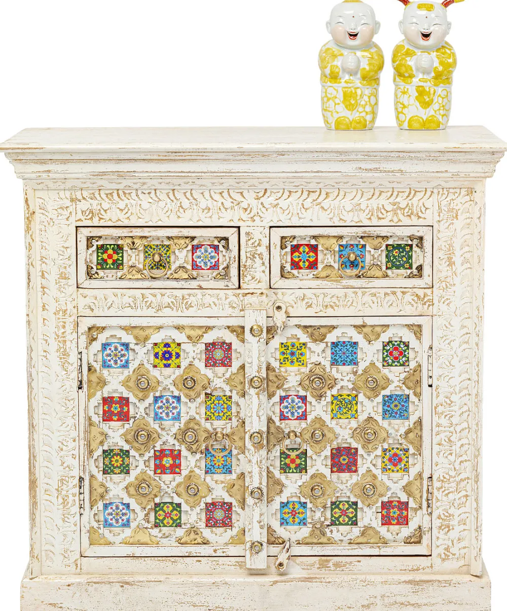 De Oosterse details, de kleuren, het hout. Alles aan Ladekast Bazar, blaast je omver! Dit geweldige meubelstuk heeft een prachtig ontwerp en zal stralen in iedere ruimte! Het gedetailleerde wit en bruin van het mangohout, de gouden versieringen en de kleurrijke tegeltjes, maken deze kast tot wat hij is. De 2 lades en de gesloten ruimte met 1 schap, maken de kast ook nog eens erg praktisch. Een sierlijk en uniek meubelstuk, voor bij jou in huis.