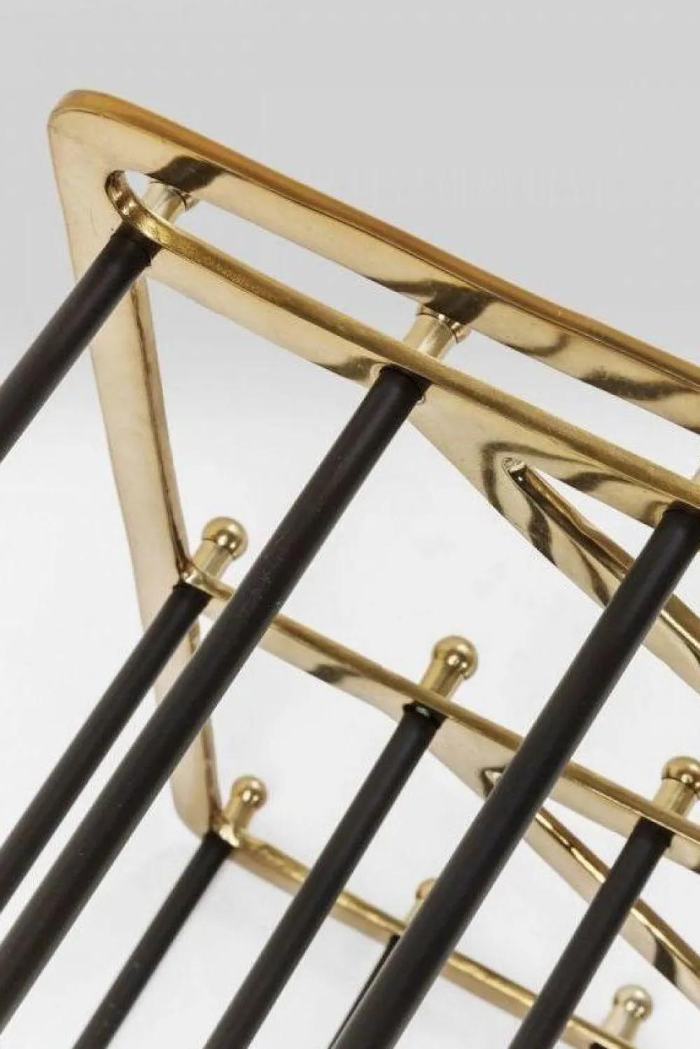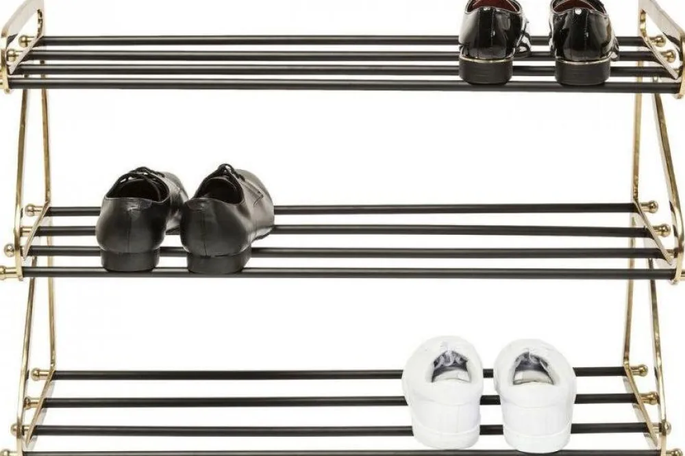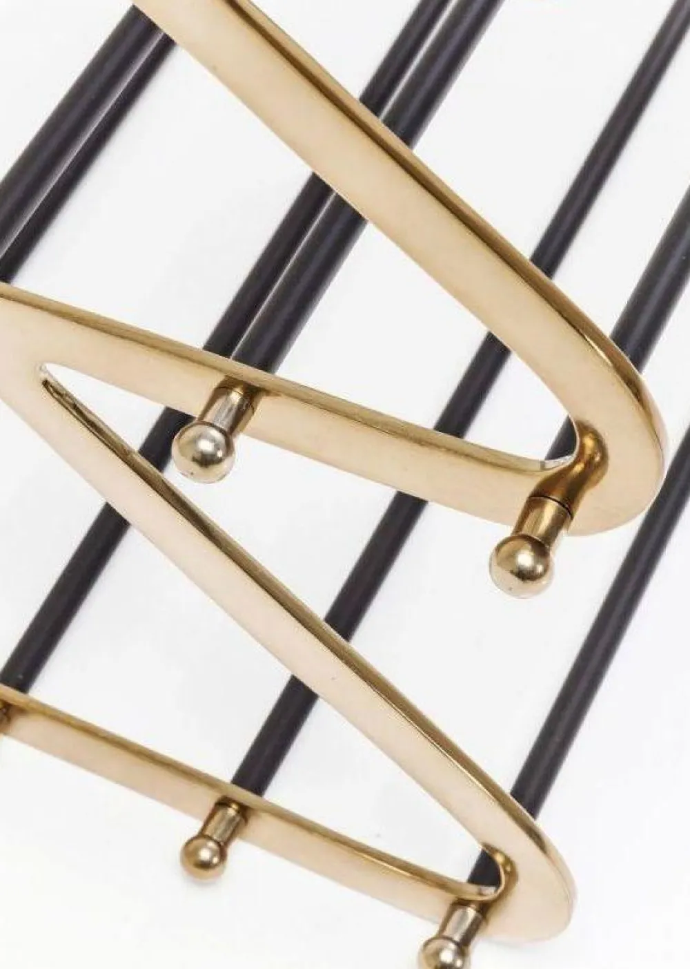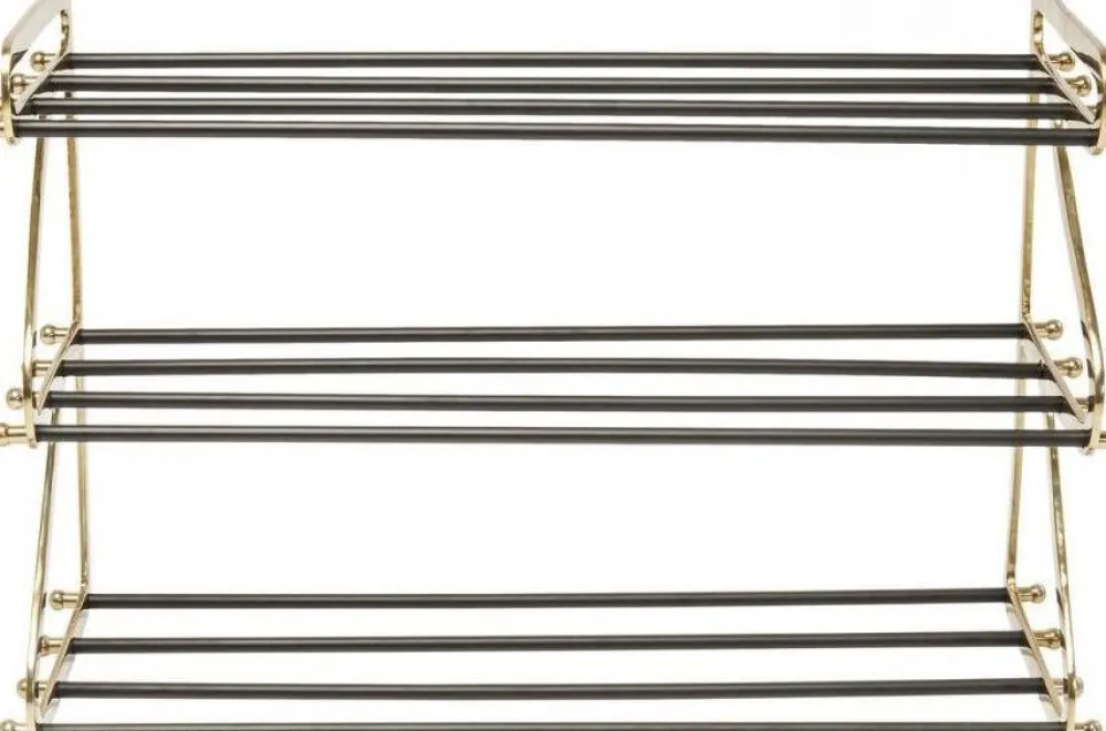 Een divers schoenenrek: als een bijzettafel, simpele schap of als dressoir. Het schoenenrek met drie schappen maakt indruk met zijn filigrane gouden frame, die verbonden is met de ronde zwart-gelakte stangen.