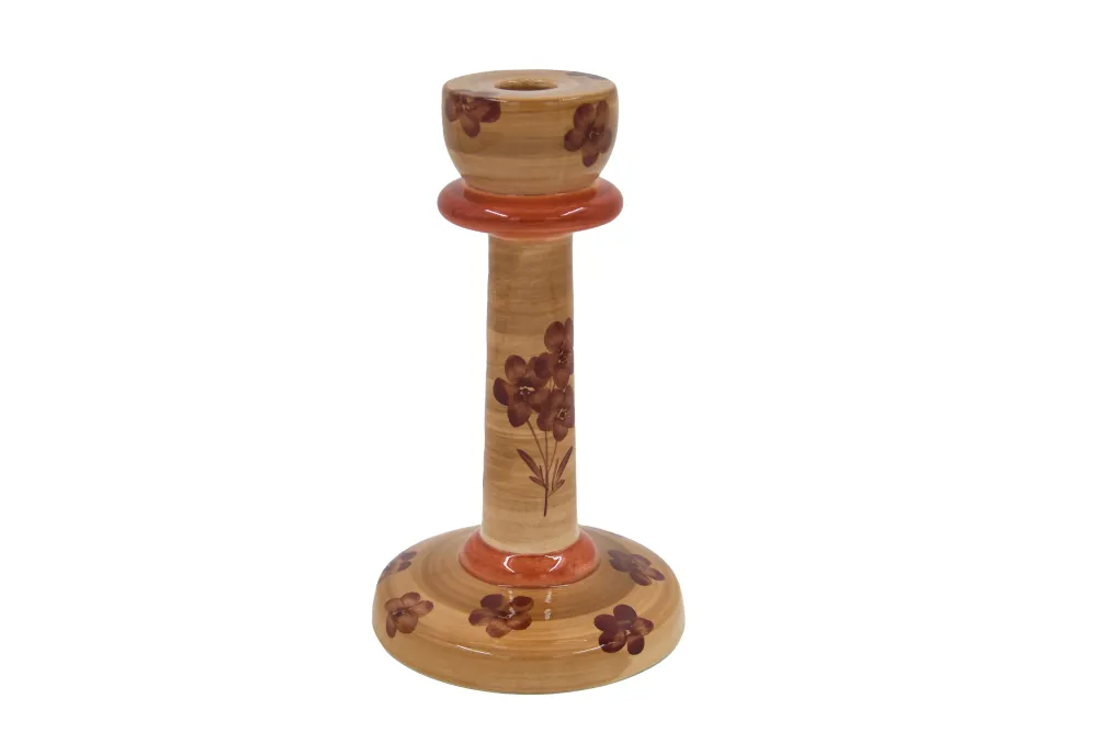 Laat je betoveren door de ingetogen elegantie van deze kandelaar, uitgevoerd in een warme beige kleur. Maar wacht, er is meer! De kandelaar is versierd met prachtige, donkere bloemen die elk exemplaar een unieke uitstraling geven. Geen enkele kandelaar is hetzelfde, dankzij het met de hand beschilderde ontwerp.
