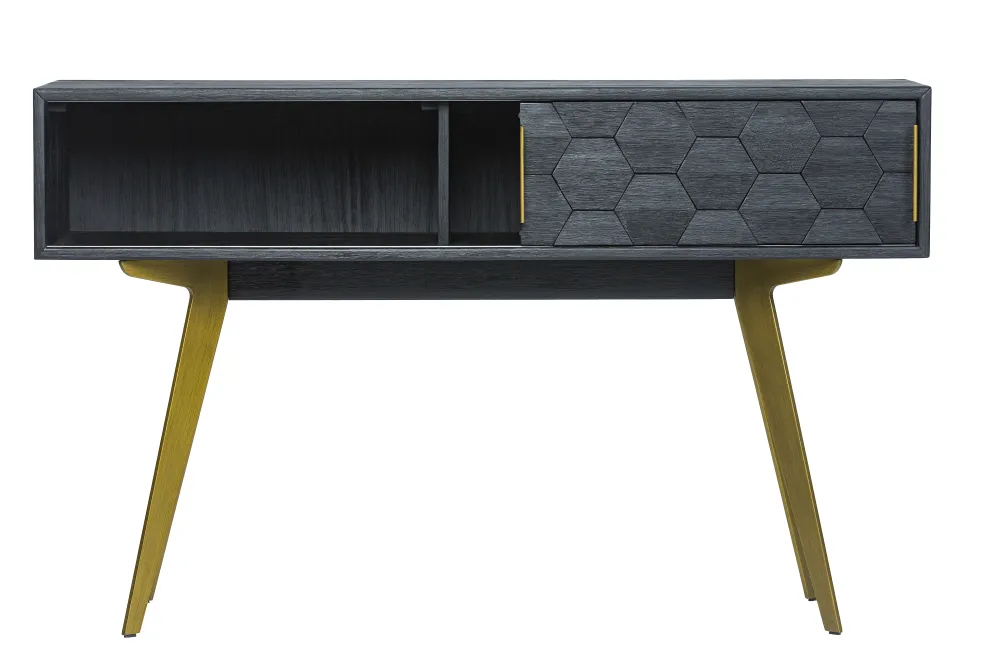 Met zijn afmetingen van 130x35x80cm past de Why Not?! sidetable moeiteloos in elke kamer, of het nu de hal, woonkamer of slaapkamer is. De gouden schuine poten en het hexagon patroon op het tafelblad geven een unieke en eigentijdse uitstraling die jouw ruimte direct transformeert tot een stijlvolle omgeving.