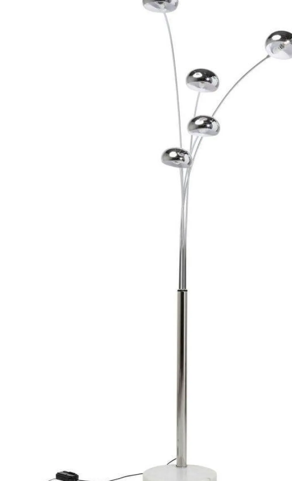 Vijfvoudig lichtontwerp – Een glanzend voorbeeld van intelligent interieurontwerp met sfeervolle aantrekkelijkheid. Marmer en chroom-gelakt ijzer zijn gecombineerd om een jeugdig decofiguur te creëren. Glanzende chroom-armen strijken omhoog vanuit de basis en creëren vijf stralen die eindigen in een ronde lamp. Ze kunnen gedimd worden en de ruimte verlichten als een zon. De Five Fingers vloerlamp maakt indruk met zijn strak-gelijnde chroom-ontwerp en originele tint van creatieve individualiteit. Een sfeervolle verbetering voor iedere ruimte, zelfs wanneer de lamp uitstaat.