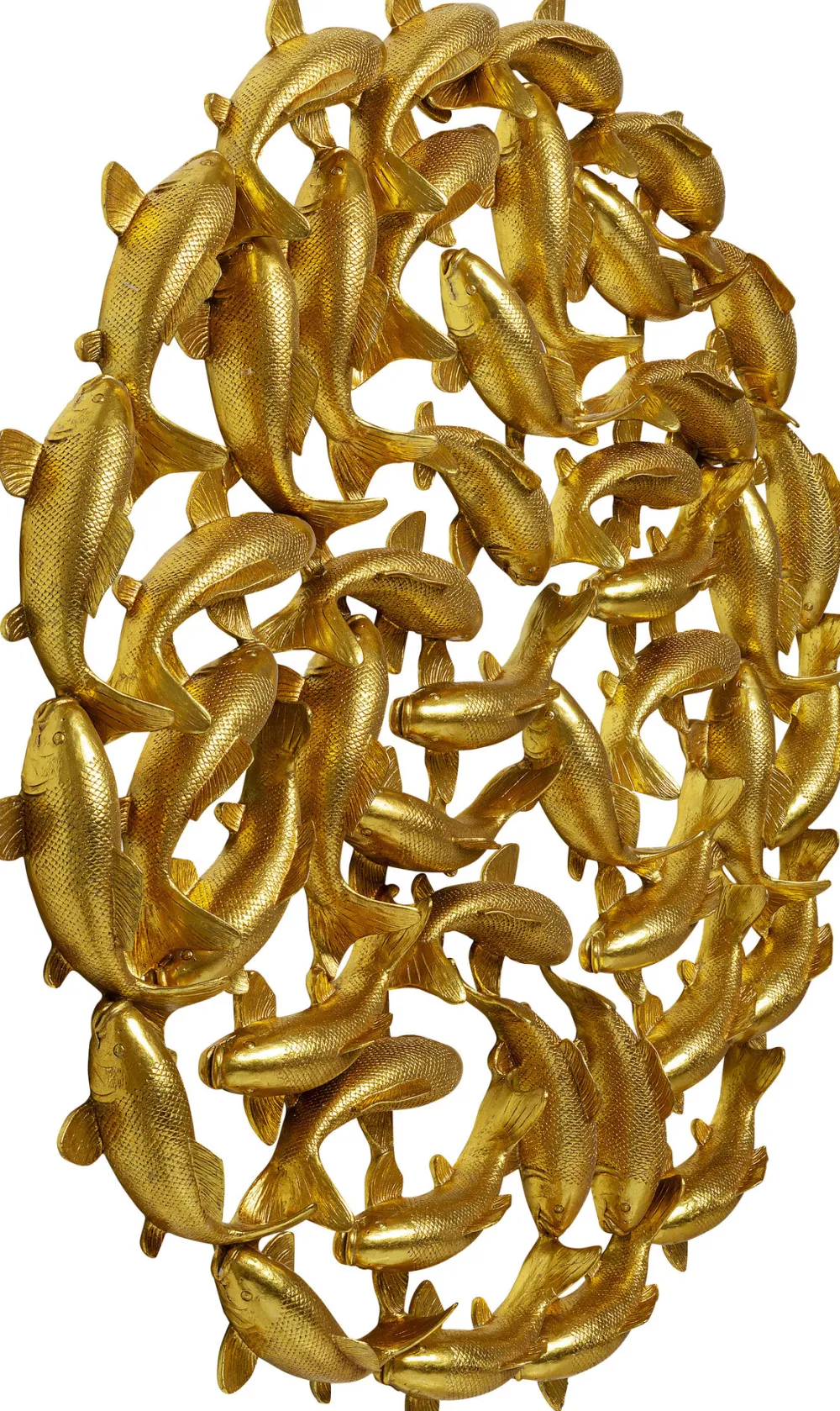 De Wanddecoratie School of Koi Gold is gemaakt van hoogwaardig glasvezel, wat zorgt voor duurzaamheid en een prachtige glanzende afwerking in goudkleur. Dit stijlvolle kunstwerk past perfect in een glamour- of modern interieur.