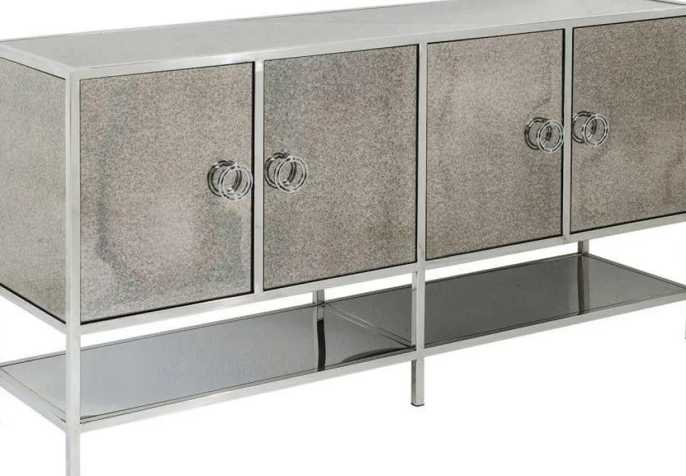 Moderne verfijning. Dit dressoir in de Moonscape serie maakt indruk met zijn unieke combinatie van duidelijke vormen, verfijnde details en monochrome look. Glanzend roestvrij staal en grijs spiegelend glas met een antieke look geven deze meubel een mystieke en glamoureuze tint. De ronde handvaten van de deur maken zijn uiterlijk succesvol compleet. Veel opbergruimte zit verstopt achter de vier deuren.
