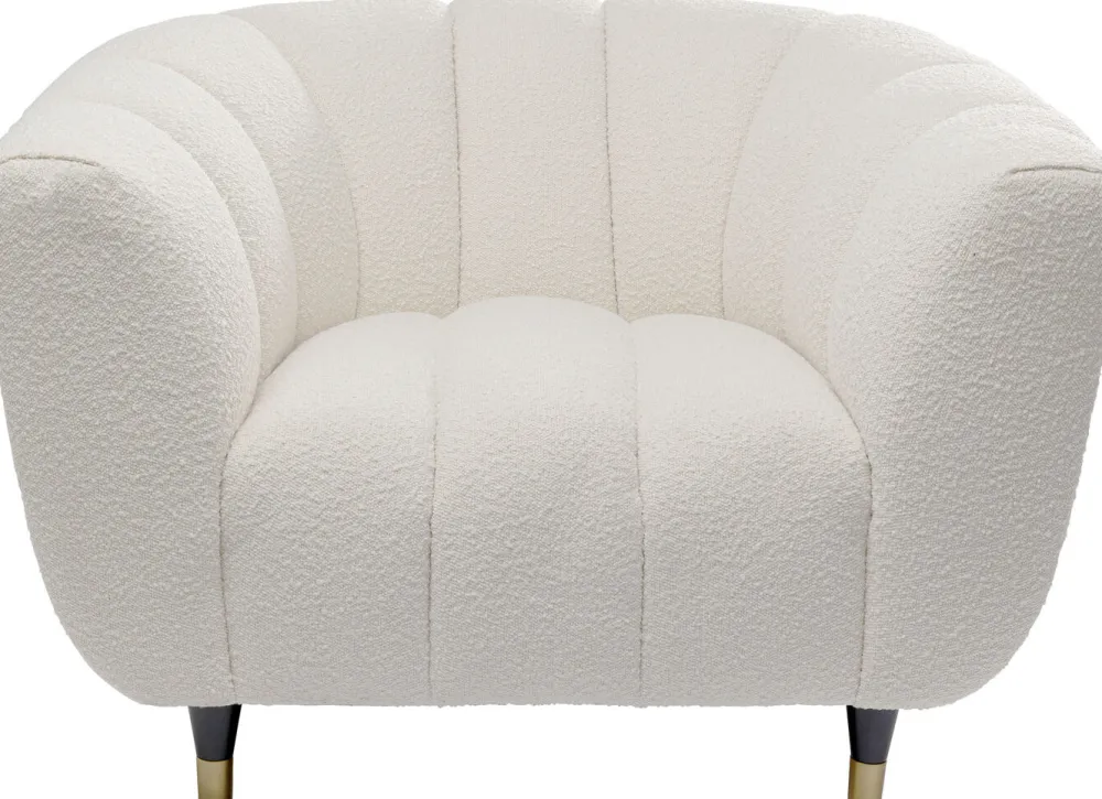 De Scandinavische stijl van deze fauteuil geeft een moderne en verfijnde uitstraling aan elk interieur. De witte bekleding en de zwarte en gouden poten voegen een vleugje elegantie toe, terwijl de gelakte afwerking met messing details het geheel een luxe uitstraling geeft.