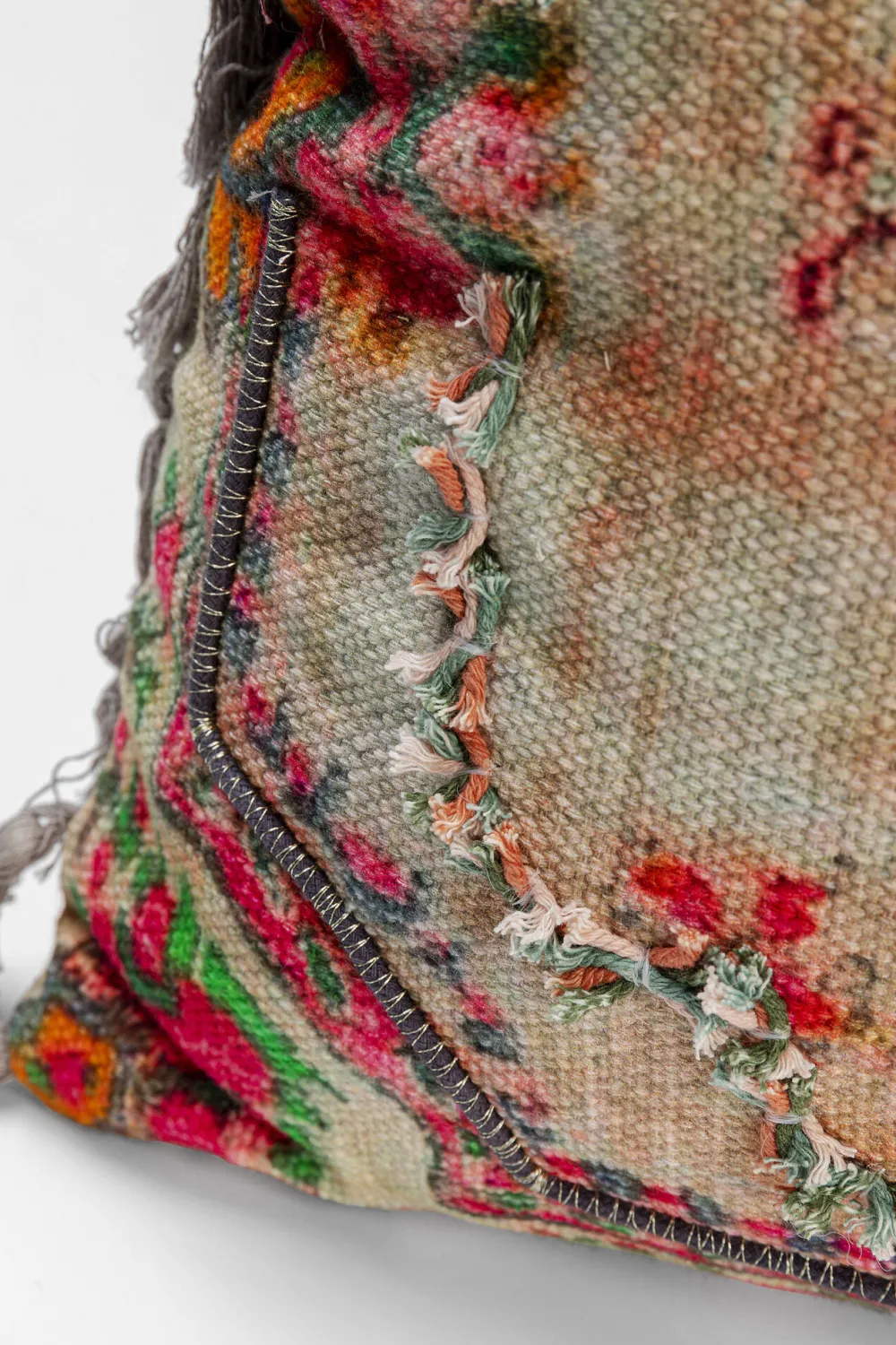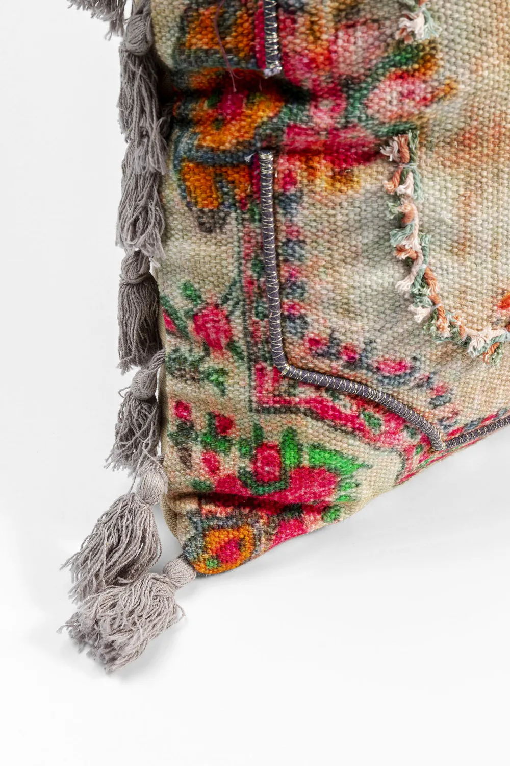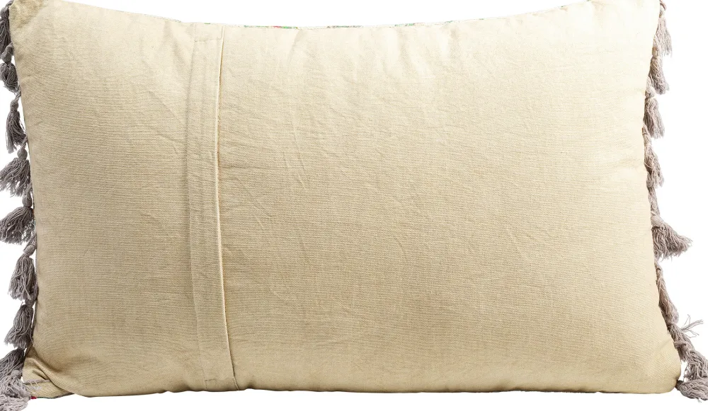Dit kussen is handgemaakt en bezit ontzettend veel uitstraling en charme! Zijn warme en vrolijke kleuren zorgen voor een geweldige look. De vele details die elkaar aanvullen en verbeteren geven deze accessoire een Boho sfeer. De franjes geven het kussen net wat extra’s en het steentje in het midden, maakt van het kussen een afrondend geheel. De hoes van katoen en de opvulling van polyester zorgen voor het comfort dat deze accessoire met zich mee brengt.