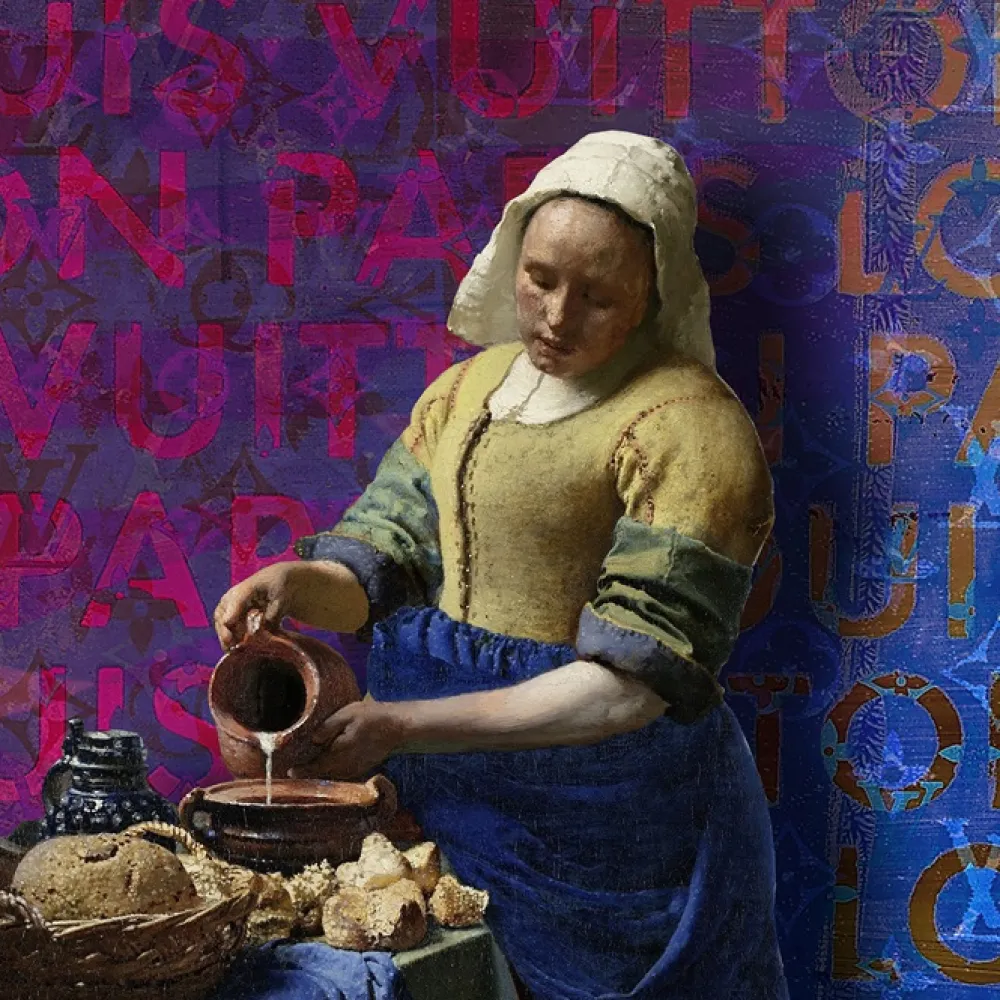 Het melkmeisje van Vermeer is een iconisch schilderij welke iedereen kent. Deze versie hebben we wat meer spice gegeven door de achtergrond in een modern jasje te stoppen. De titel laat je nog eens anders kijken naar dit schilderij.