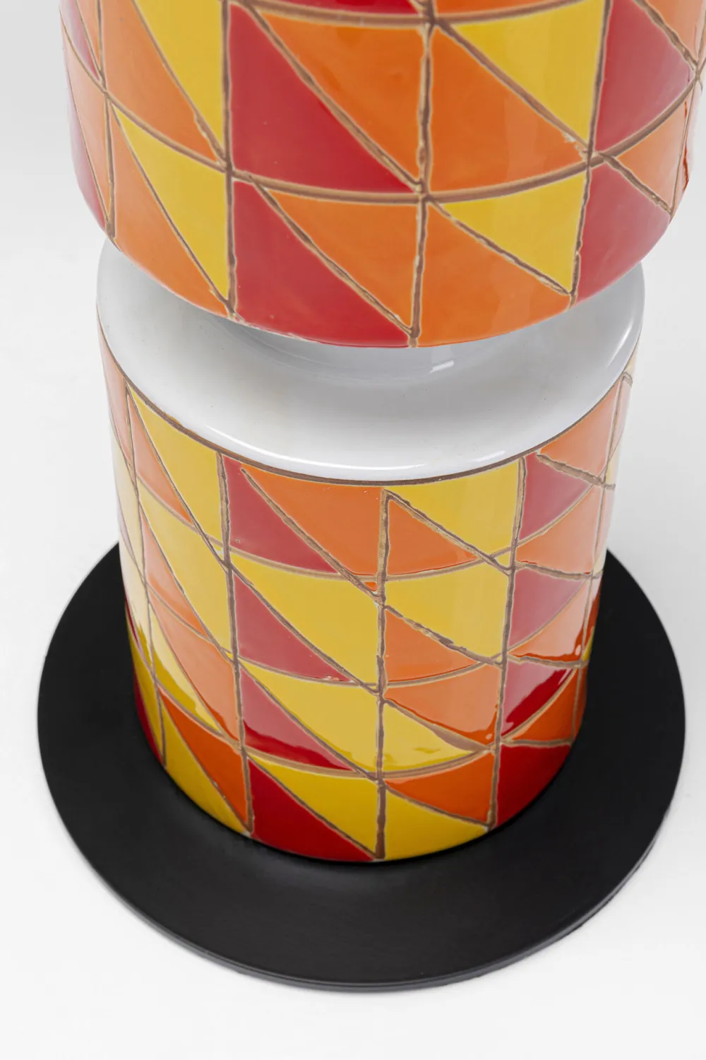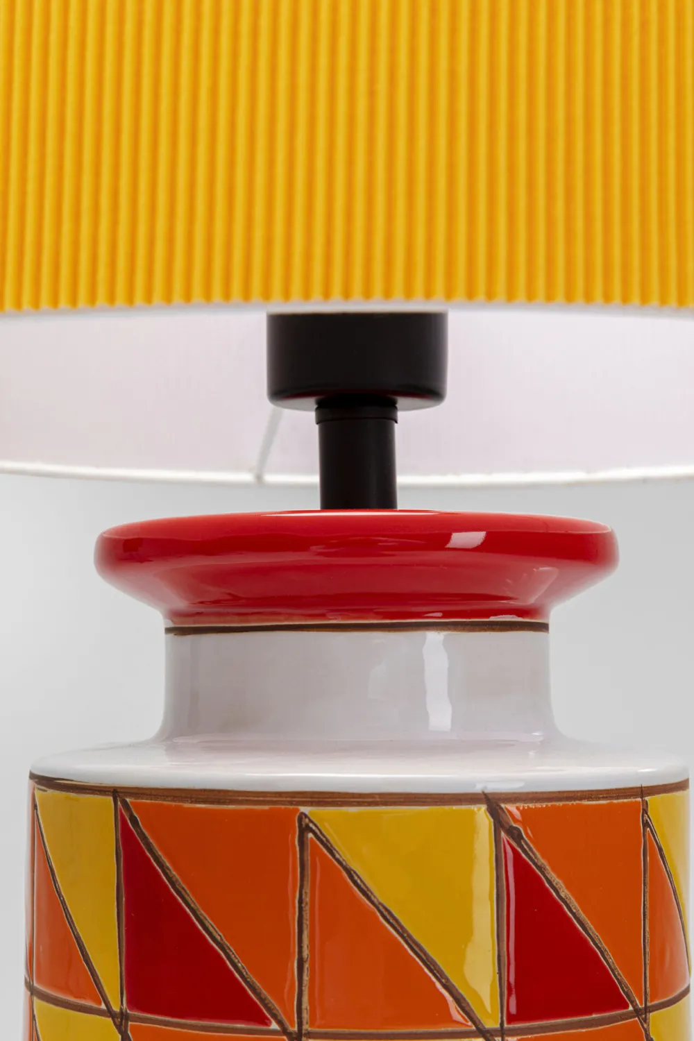 De lamp is vervaardigd met hoogwaardige materialen zoals vezel, staal en keramiek, wat resulteert in duurzaamheid en een unieke uitstraling. De lampenkap is gemaakt van polyester en heeft een levendige oranje kleur die een warme gloed verspreidt wanneer de lamp is ingeschakeld.