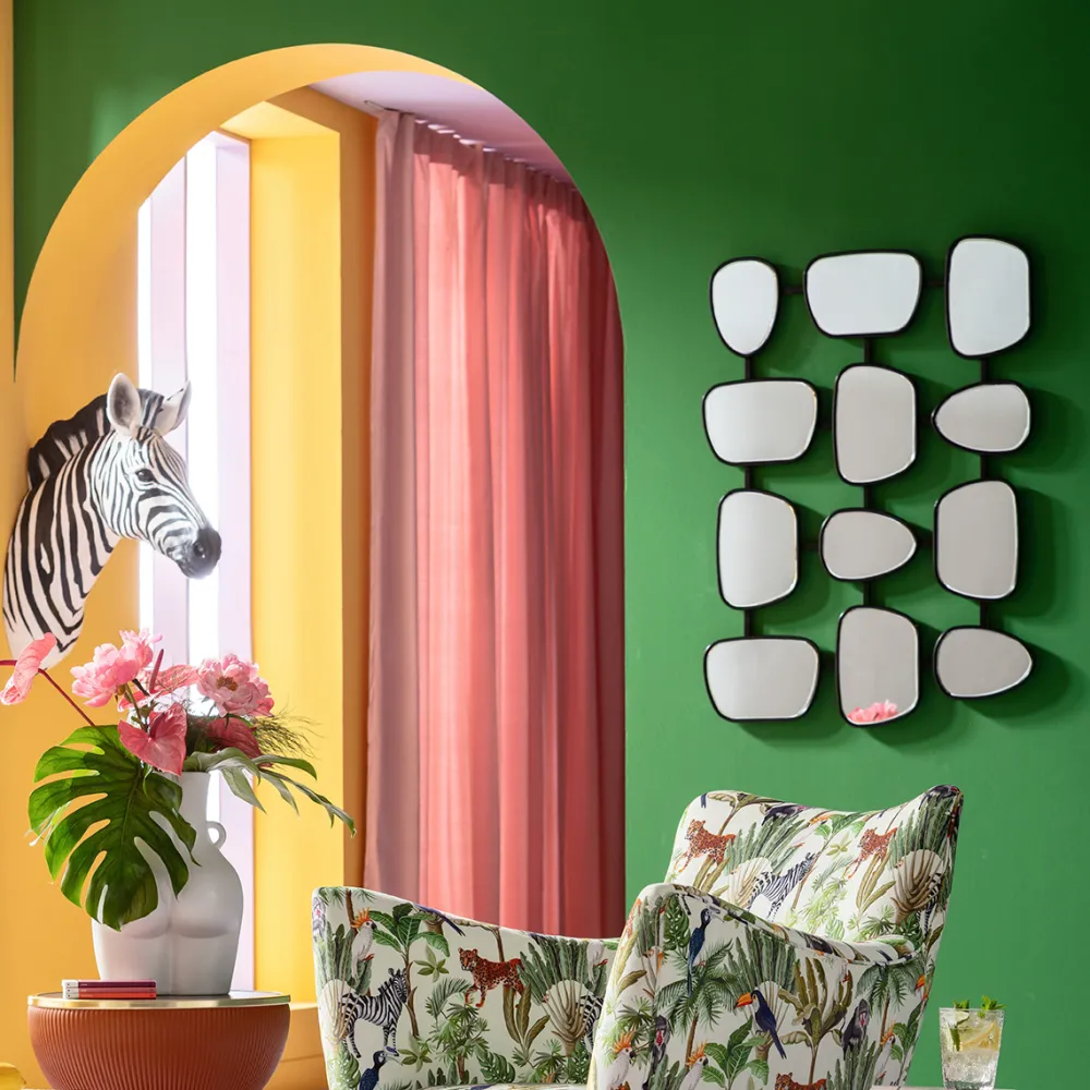 Met een breedte van 80 cm en een hoogte van 114.3 cm is deze wandspiegel niet te missen. Het asymmetrische ontwerp voegt een speels element toe aan je interieur, terwijl het strakke zwarte frame van staal en MDF een stoere en eigentijdse uitstraling biedt.
